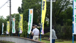 横断幕とのぼりでの呼びかけの様子